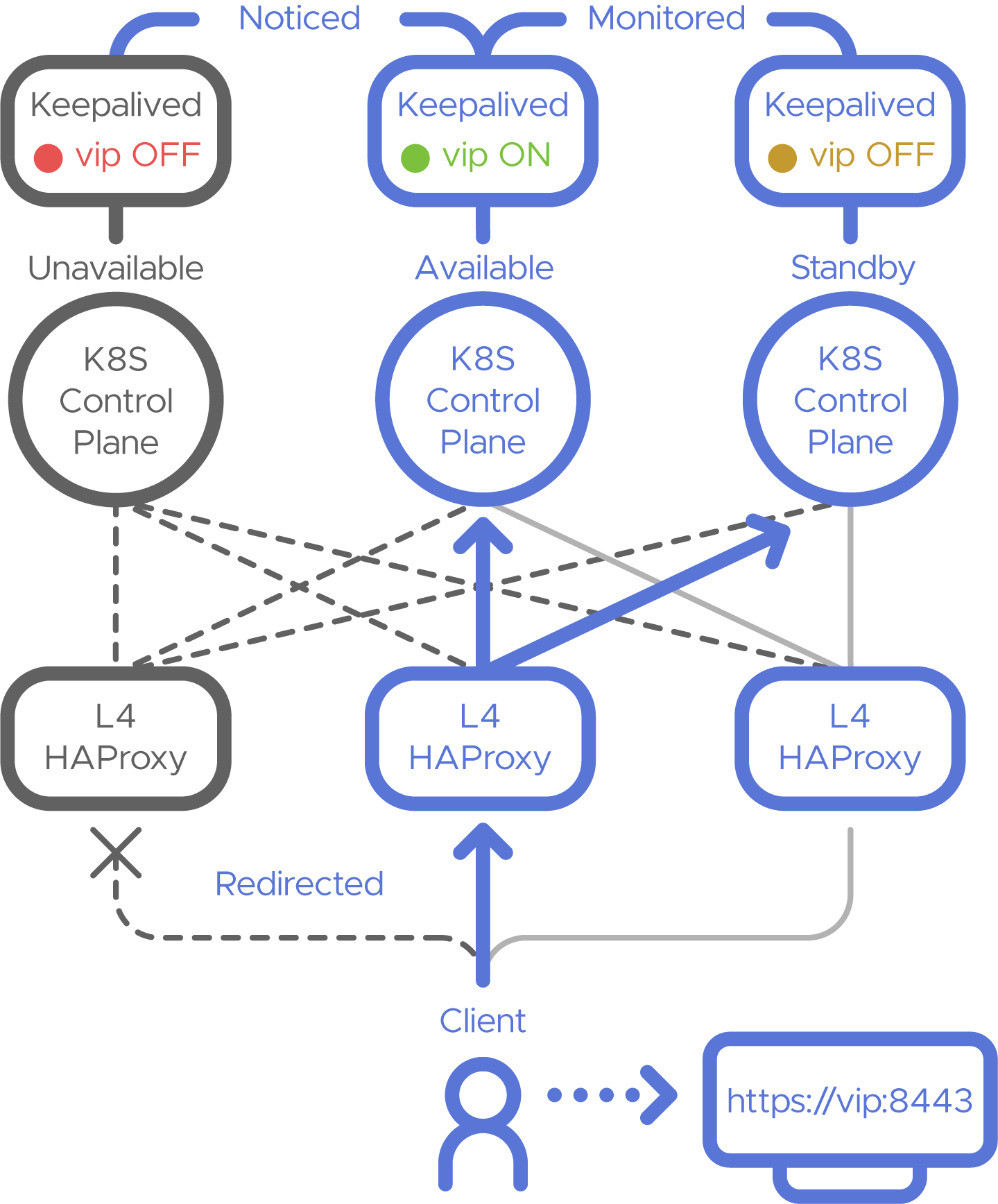 Keepalived(VIP Manager)와 Layer 4(L4) HAProxy를 각각의 마스터 노드에 스태틱 파드 형태로 배포하여 쿠버네티스 마스터 노드의 고가용성(HA)을