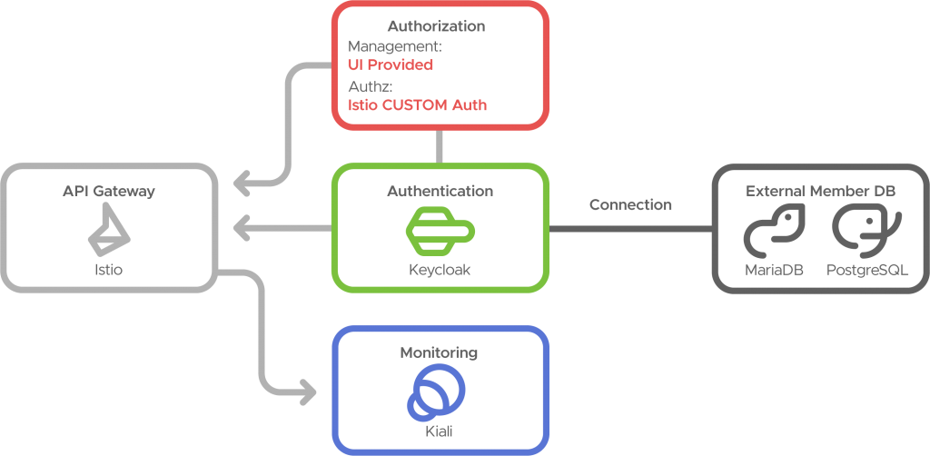 더 세부적인 기능을 다뤄보자면, 인증 제어 측면에서는 Istio와 Kiali를 연동함으로서 Service, Application, Workload를 모니터링 할 수 있게 하고, Istio와 Keycloak을 연동해 Authentication, Authorization을 구현합니다. 또한, 외부 회원 DB를 연동한 인증 기능, JWT Token Customization 기능, 그리고 SSO 서비스를 제공하며, Authz 모듈은 K8S Operator가 제어합니다.